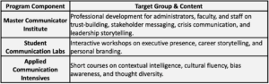 To make business and professional communication a true differentiator, institutions need a comprehensive program that integrates leadership development, pedagogy, and student preparation. We envision three core components: